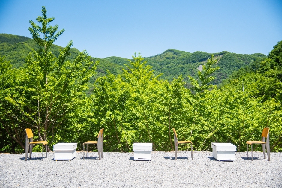 옐로우트리카페는 육백마지기 산자락 아래 일만평 은행나무숲속에 자리잡은 카페이다. 소나무길 사이를 따라가다 보면 이렇게 외진 곳에 카페가 있을까 싶은 곳, 천 오백 그루 이상의 은행나무 숲 사이에 카페가 자리잡고 있다. 그야말로 숲카페라고 할 수 있다. 산책로,해먹,방갈로 등 방문객들이 음료한잔과 함께 충분한 휴식을 즐길 수 있는 자연 그대로의 공간이 마련되어 있다.
