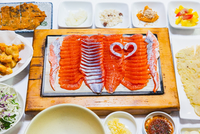 산에서 내려오는 암반수 물에 수족관에서 며칠 지낸 송어의 육질이 단단하고 탱글탱글한 맛이 일품이다.
