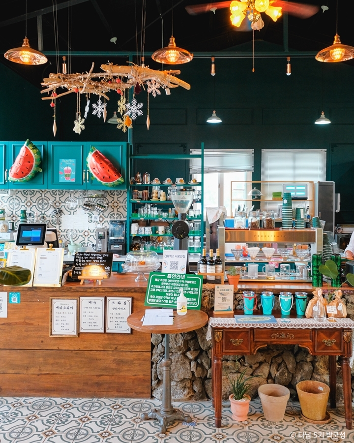제주 시내에 자리한 카페로, “인더그린”이란 이름처럼 작은 숲속에 들어와 있는 것처럼 꾸며진 실내가 인상적이다. 초록빛 식물로 가득 채워진 카페 내부는 앤티크한 가구와 소품, 따스한 조명이 어우러진 독특한 분위기가 매력적이다. 일부 식물과 토분은 저렴한 가격에 판매도 겸하고 있어 관심 있는 현지인들이 일부러 찾아오기도 한다. 또 리스 만들기 같은 각종 식물 관련 원 데이 클래스도 이 공간에서 이뤄진다. 카페 인더그린에서 가장 인기 있는 공간은 6,600㎡에 이르는 야외 정원이다. 가벼운 산책과 함께 자연 속에서 힐링하는 기분도 느낄 수 있다. 음료도 다양하게 맛볼 수 있으며 푸짐한 브런치와 디저트, 커피는 물론 수박 맥주와 와인 등 가벼운 알코올 드링크도 즐길 수 있다.