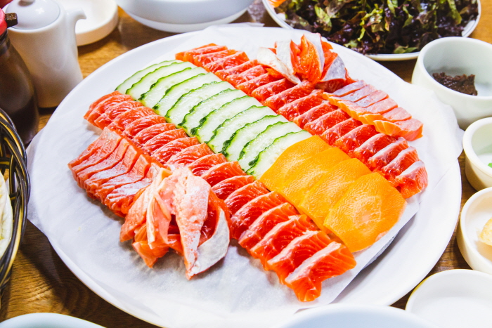 1급수의 수질로 송어회의 품질이 뛰어나며, 얼린 돌판 위에 송어회가 올라가 신선하게 식사를 할 수는 곳이다.