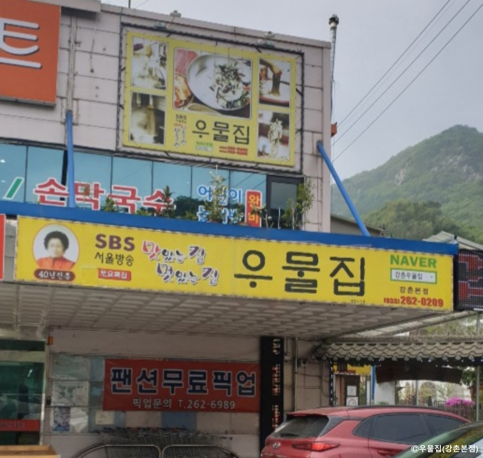 우물집 본점은 강원도 춘천시 강촌에 있는 닭갈비와 막국수 식당이다. 40년이 넘게 영업해서 다녀간 유명인도 많고 맛집으로 소개되어 사진이나 서명이 벽을 다 덮고 있고 방송 출연이 많아서 유명세를 많이 타고 있는 식당이다. 전통적인 닭갈비 메뉴로 이곳은 숯불닭갈비만 하는 식당이다. 숯불 향을 더 느끼고 싶다면 소금 양념으로, 산야초로 맛을 낸 양념 맛이 좋다면 고추장 양념구이를 선택하면 된다. 반찬이 간결한데 깊은 맛이 있다. 이벤트 행사로 감자전을 서비스로 제공하고, 메밀막국수를 후식 메뉴로 즐길 수 있어 강원도의 맛을 모두 볼 수 있다. 6명 이상이면 픽업 서비스를 받을 수도 있다. 예약은 전화로 해야 한다. 주차는 매장 앞에 할 수 있다.