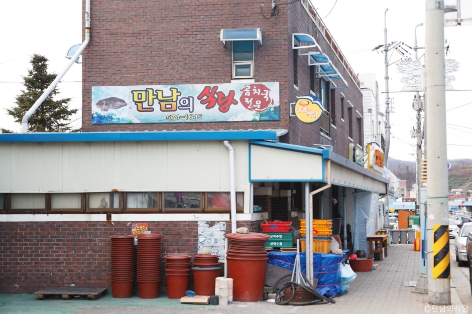 곰치는 생김새는 투박하고 못생겼지만 살은 부드럽고, 국물은 시원하게 우러난다. 큼직한 곰치를 넣고 얼큰하게 끓여 나온 곰치국은 뜨끈하게 속을 풀어줘 애주가들이라면 놓칠 수 없는 즐거움이다. 만남의식당 벽과 천정에는 이곳을 찾았던 사람들이 남긴 메시지와 사인으로 가득하다. 식당이 크지는 않지만 빠른 회전으로 오래 기다리지 않아도 맛있는 곰치국을 맛볼 수 있다. 만약 제철 맞은 곰치가 없더라도 실한 대구해장국과 생태탕이 있어 그 아쉬움을 달래준다.