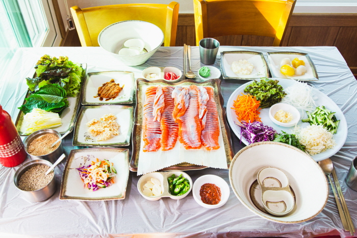 송어 양식장 內의 송어횟집으로 직접 생산한 송어를 대접하므로 신선하고 싱싱한 회를 제공하는 맛집이다.