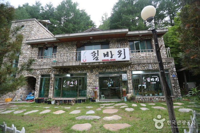 쉼바위는 서울에서 약 2시간 30분가량 소요되며, happy700고지(인체의 생체리듬이 가장 활발해지는 고지)의 공기 좋고 풍경 좋은 우리나라에서 다섯 번째로 높은 산인 계방산 자락에 위치해 있다. 특히 계방산은 눈꽃 덮인 설경과 주목군락지로 요즘 각광받는 겨울산이기도 하며 바로 등산로 아래에 오토캠핑장이 있어 가족단위로 여가를 즐기기에 좋다. 유명한 관광지로는 이승복기념관과 방아다리약수, 오대산 월정사, 봉평 메및꽃마을, 용평스키장, 휘닉스파크가 인접해 있으며, 겨울엔 스키, 여름엔 래프팅과 산악오토바이 등으로 스포츠와 연계하여 여러 종류의 다양한 관광을 즐길 수 있다. 쉼바위의 송어회는 콩가루, 들깨가루를 야채와 함께 버무려 먹는 방식으로 요즘 많은 사람들이 관심 있는 웰빙(참살이)에 적합한 음식이다. 이곳의 모든 채소와 나물은 주위의 자연에서 얻은, 오염되지 않은 먹을거리로 제공되며, 특히 돌솥에 먹을 양의 밥을 바로바로 지어내므로, 뜨끈한 밥 맛과 함께 숭늉의 구수함이 일품인 곳이다. 평창군에서 지정한 모범업소이다.
