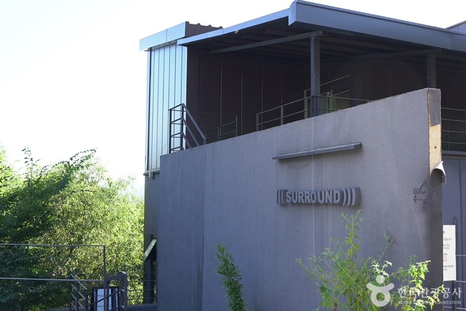 카페 써라운드는 커피, 공간, 풍경 그리고 음악에 둘러싸인 특색 있는 공간이다. 경사로를 올라가야 나오는 한적한 언덕 즈음에 위치해 있어 파란 하늘과 초록의 풍경에 둘러싸여 있다. 커피향으로 가득한 1층에는 세 가지의 종류의 원두를 사용한 핸드드립 커피와 티, 에이드의 음료를 즐길 수 있으며 휘낭시에와 스콘 등의 베이커리 디저트가 준비되어 있다. 음향에 세심하게 신경을 쓴 1층 카페는 음악 소리가 공간을 타고 퍼지도록 넓고 층고가 높게 설계되었다. 통유리창 너머 초록의 정원을 바로 마주한 2인용 소파 자리는 언제나 인기다.