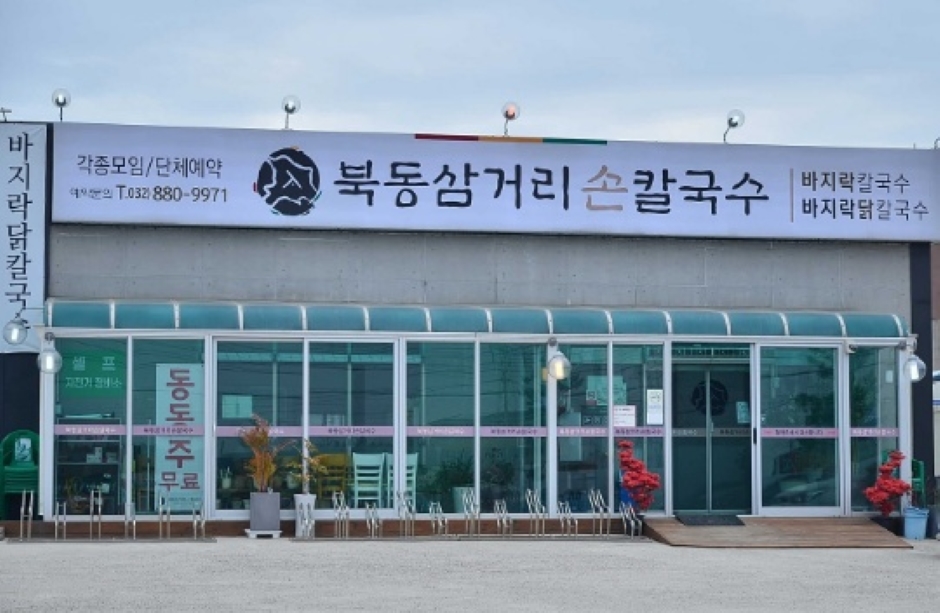 북동 삼거리손 칼국수는 경기도 안산시 대부도에 위치한 칼국수 전문점이다. 바지락을 사용하여 국물이 시원하고 개운한 바지락칼국수가 있고, 바지락의 시원함과 닭의 담백함이 어우러진 바지락 닭칼국수가 있다. 바지락은 껍데기를 일일이 벗기지 않아도 좋게 손질된 바지락을 사용하는데 알이 굵어 식감이 좋다. 특히, 100여 개가 넘는 대부도 칼국숫집 중 유일하게 닭고기가 들어간 바지락 닭칼국수는 인기가 좋다. 직접 가게에서 국내산 재료로 담근 배추김치, 무김치, 열무김치가 기본 찬으로 제공되고 동동주는 무료로 가져다 먹을 수 있다. 크고 맛있는 해물파전도 인기 메뉴이며 넓은 주차공간에 자전거 동호인들을 위한 자전거 거치대도 준비해 놓았다.