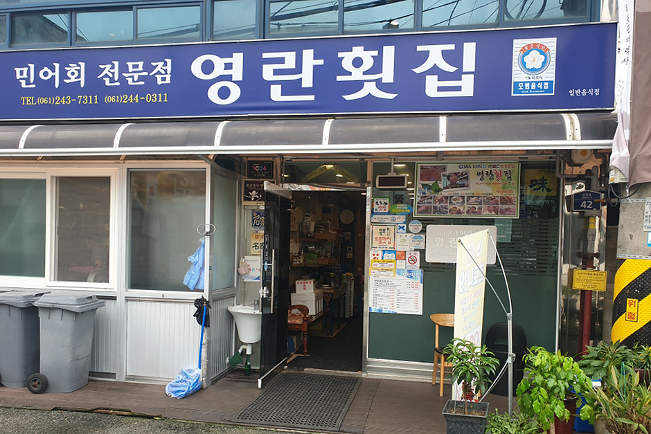 전국에서 민어회로 가장 유명한 영란 횟집은 목포 민어의 거리에서 1961년에 개업하여 50년이 넘는 내공을 가진 식당이다. 크기가 크고 뼈가 단단해 손질하기 어려운 생선인 민어를 저온에서 하루 정도 숙성해서 선어로 먹는데, 숙성하면 식감이 부드러워지고 맛도 깊어지며 단맛이 나는 특징을 갖고 있다. 민어 코스 정식은 잘 숙성된 맛있는 민어를 회, 전, 매운탕 그리고 회무침까지 한 번에 맛볼 수 있다. 회무침은 민어회 무침 명인의 손맛이 담긴 직접 담근 막걸리 식초를 넣어 만들어 그 맛이 일품이다. 또한 민어 껍질과 함께 17가지 맛이 난다는 민어의 부레도 내어준다.