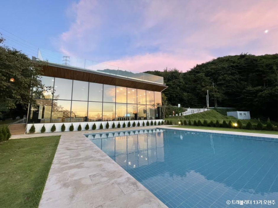 광덕산 자락에 자리를 잡아, 푸른 광덕산과 시원한 수영장 뷰로 유명한 카페다. ‘숲이 파도처럼 너울거리며 다가온다’는 뜻의 이름을 가지고 있다. 넓은 실내에서 통창을 통해 바깥의 풍경을 한눈에 조망할 수 있다. 카페 2층의 루프탑에는 얕은 수영장과 징검다리가 설치되어 있는데 포토 존으로 유명하다. 루프탑은 안전상의 이유로 노키즈 존으로 운영 중이다.