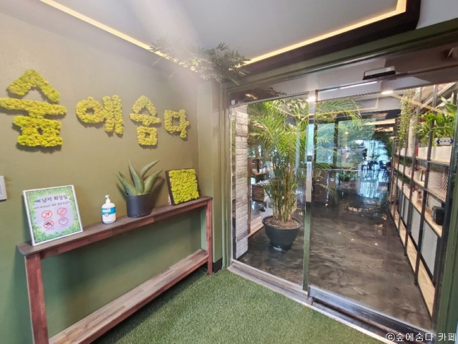 숲에 숨다는 경기도 시흥시 물왕동 물왕 저수지에 위치한 숲 콘셉트의 카페이다. 3층 건물로 1층에는 겨울 텐트와 필로티 테이블이 있고, 2층에는 메인 공간과 주문 공간, 화장실이 있다. 3층에는 겨울 텐트와 2인 전용 테이블이 있다. 숲 콘셉트의 카페인만큼 매장은 많은 식물로 인테리어가 되어있으며, 텐트 안에서 휴식을 취할 수 있다. 다양한 브런치 메뉴, 음료, 쿠키, 케이크, 수제청 등을 판매하고 있다.