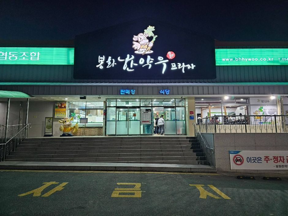 ‘봉화한약우프라자’는 경북 봉화군에 위치한 식당이다. 봉화한약우는 당귀, 백출, 작약 등 다양한 한약재가 들어간 사료를 먹고 자라 맛과 품질이 우수하다. 한약재를 먹었기 때문에 저항력이 강한 봉화한약우는 소고기 맛을 좌우하는 올레인산 함량이 일반 소고기에 비해 높다. 식당 내부가 넓어 모임 장소로 적합하다. 이곳의 인기 메뉴는 등심과 특수부위 구이이며 그 외에도 다양한 소고기 부위가 있고 불고기, 육회비빔밥 등 다양한 식사 메뉴도 준비되어 있어 취향껏 메뉴선택이 가능하다.