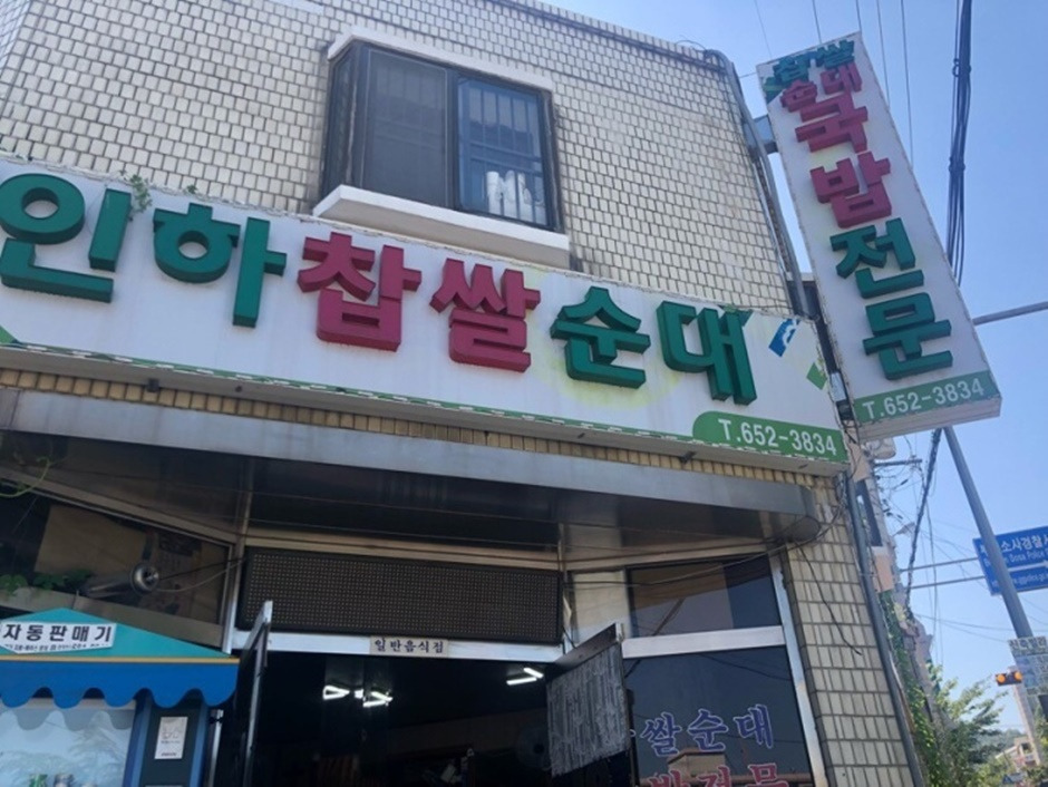 중소밴처기업부 인증 백년가게다. 백년가게는 30년 이상 명맥을 유지하면서도 오래도록 고객의 꾸준한 사랑을 받아온 점포 가운데, 중소벤처기업부로부터 그 우수성과 성장 가능성을 높게 평가받아 공식 인증받은 점포다. 1985년 부천 어느 경찰서 앞에서 십여 년간 외항선을 타고 받은 남자의 퇴직금과 여자가 틈틈이 모은 돈으로 조그만 식당을 개업했다. 그 자리에서 40여 년 동안 걸려 있는 간판이 바로 인하 찹쌀 순대집으로 오랜 역사와 전통을 자랑한다. 오래된 듯한 건물에 내부는 좌식과 테이블 석을 갖추고 있으며 특히 국밥과 함께 나오는 깍두기 맛이 일품이다.