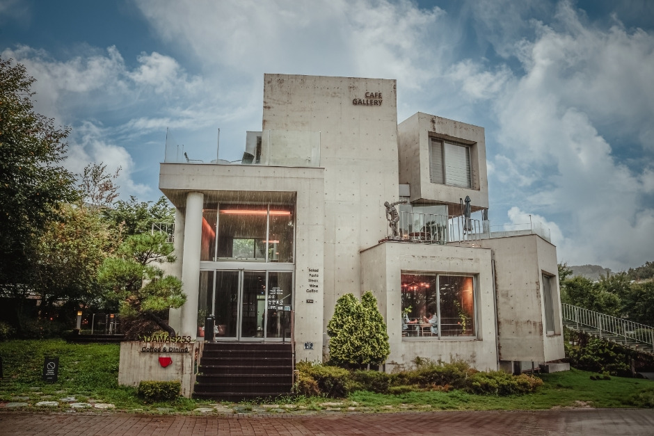 ‘카페 아다마스 253’은 파주시 헤이리마을에 있는 스파게티, 파스타 전문점이다. 2013년도 SBS 방영 드라마 ‘별에서 온 그대’ 촬영지로 파스타와 스테이크, 커피가 맛있기로 소문이 났다. 커다란 회색빛의 큐브형 건물로 입구에서 바로 올라갈 수 있는 2층은 유리로 된 테라스가 통으로 열리는 멋진 공간이다. 이곳에서 헤이리 예술인마을의 주변 풍경을 조망할 수 있다. 메뉴 중 모카프레소는 직접 만든 수제 쇼콜라와 생크림을 사용해 맛이 탁월하다. 샤커레토는 에스프레소에 얼음과 시럽을 넣고 바리스타가 직접 셰이크 해서 풍성한 거품을 만들며 비주얼도 독특할 뿐만 아니라 달콤하고 부드러운 거품이 어우러진 커피 맛이 매력적이다. 음식을 주문하면 커피는 할인 가격으로 제공한다. 갤러리 카페로 가볍게 부담 없이 작품도 감상하고, 좋은 음악도 감상하면서 커피를 마시거나 노트북을 들고 와서 작업해도 좋고, 야외 테라스에 앉아 주변 경치를 즐길 수도 있다. 특히 밤에는 야경이 멋진 장소이다.