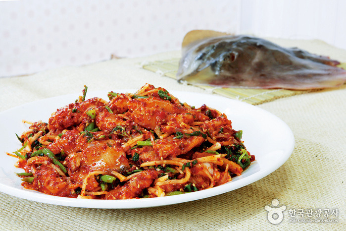 전남 진도 서천의 청룡에서 갓 잡아온 신선하고 통통한 간재미와 바지락을 회를 쳐 향긋한 미나리와 버무린 간재미무침과 바지락무침이 바로 이 집의 주메뉴이다. 미나리를 듬뿍 넣고 새콤 달콤하게 무쳐 비리지 않고 육질이 담백하다. 이 집만의 집 식초를 사용하는 것이 생선 살의 육질을 탱글하게 하며 맛을 내는 비결이라고 한다. 단백질, 비타민, 미네랄 등의 영양도 풍부해 몸에 좋다. 뭐니 뭐니 해도 술안주로 이만한 것이 없을 듯싶다. 거기다 전어회나 계절음식인 논고동회 등은 이 집의 자랑인 간재미탕과 함께 깔끔하고 맛이 있어 인기가 좋다.