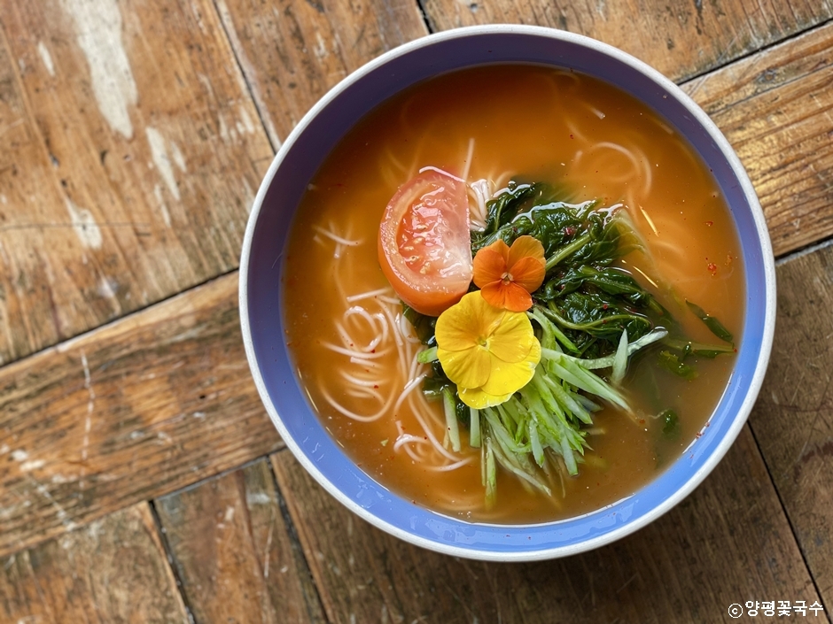 양평꽃국수는 양평군 옥천면 신복리에 있는 국수 전문점이다. 한옥을 개조하여 형형색색 화려한 꽃과 나무들이 배치되어 맛은 기본이고 눈에 들어오는 풍경에 눈길을 빼앗기는 곳이다. 국수는 77년 3대째 대를 이어오는 충청남도 예산군에 위치한 ‘쌍송국수’ 집의 중간 면을 사용한다. 쌍송국수는 햇빛과 바람에 직접 말려 밀가루 냄새가 나지 않고 면발이 찰지다. 국수에는 군위에서 생산되는 거세한 한우 뼈와 고기만을 사용한다. 대표 음식인 송이갈비국수에 들어가는 사골 육수는 야채가 듬뿍 들어가 진하면서 시원한 맛이 일품이다. 모두 국수 위에 음식 맛만큼 이쁜 꽃이 올라가 눈이 더욱 즐거운 음식을 제공한다.