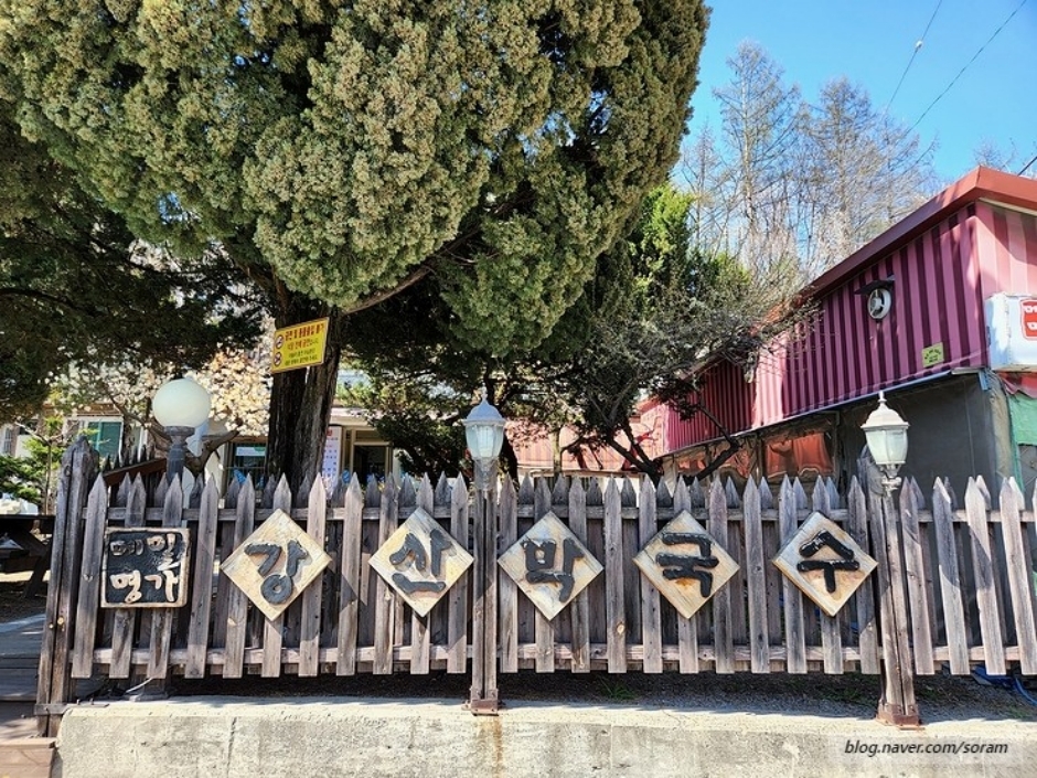 강산 막국수는 태백시 황지동에 있다. 봄이면 목련이 흐드러지게 피는 넓은 정원을 지나야 매장이 나온다. 막국수를 전문으로 하는 곳으로 대표 메뉴는 막국수와 수육, 곁들여 먹을 수 있는 녹두 부침, 감자 부침, 수육, 가자미회 등이 있다. 수육은 윤기가 흐르고, 비빔막국수는 고소한 기름 냄새를 풍기며, 물막국수는 새콤한 국물이 시원하다. 평소에도 웨이팅이 길기 때문에 도착하면 대기자 명단에 이름과 인원수를 빠르게 적고 정원을 둘러보며 기다리면 된다.