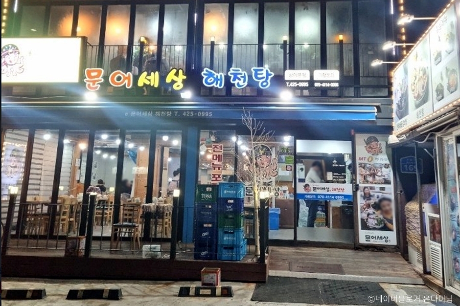 문바리 문어세상 해천탕 집은 9호선 송파나루역 3번 출구 인근에 있다. 주차는 발레파킹 서비스(유료)를 받을 수 있다. 지하철 출구 바로 있어 대중교통을 이용하는 게 좋다. 실내는 넓고 테이블마다 컵과 그릇이 세팅되어 있고 메뉴판은 따로 없고 테이블보가 메뉴판이다. 이 집의 메뉴는 해천탕, 문어연포탕, 해신탕이 있고 점심 메뉴로 홍합칼국수, 전복정식, 문어볶음, 꼬막비빔밥, 해물갈비탕 등이 있다. 해천탕을 주문하면 기본 반찬 다섯 가지와 해물 찍어 먹을 소스 세 종류가 나오고 해천탕 안 전복, 문어, 가리비 등 해산물과 미나리가 푸짐하게 들어가고 해산물은 직접 다 손질해서 먹게 해 준다. 마무리로 칼국수 사리 또는 죽을 추가 해서 먹을 수 있다.