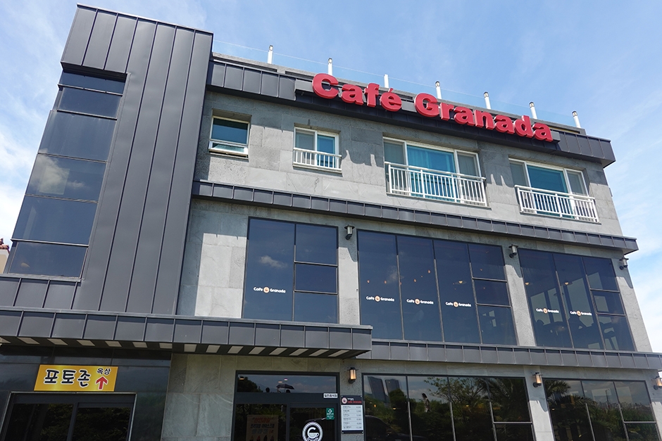 그라나다 카페는 제주공항 활주로 옆에 있다. 비행기가 뜨고 내리는 모습을 가장 가까이에서 볼 수 있는 카페다. 옥상에 올라가면 하늘을 나는 비행기를 배경으로 사진을 찍을 수 있다. 2층 창을 통해서는 제주공항 활주로가 훤히 내려다 보이며, 바닷가 카페이지만 바다는 보이지 않고, 한라산을 향해 창이 나 있다. 근처 여행지로 도두봉, 무지개해안도로가 있으며 공항 가기 전 들르기 좋은 카페이다.