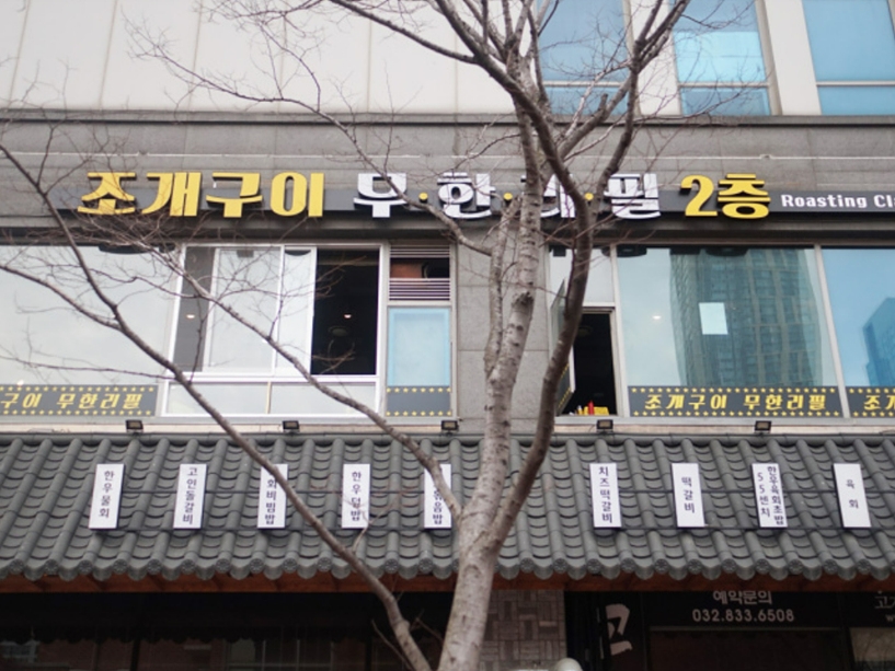 송도조개창고는 인천 송도센트럴파크 인근에 위치해 있는 조개구이집이다. 이곳은 시간제한 없이 본인이 원하는 조개만 골라 먹을 수 있는 무한리필 조개창고이다. 최고의 선도를 자랑하는 다양한 조개들을 해수에 보관하여 손님들이 최적이 상태로 즐길 수 있게 제공하고 있다. 전복과 키조개, 가리비 등의 조개들과 함께 육즙이 가득한 삼겹살, 항정살, 갈매기살 등의 고기도 구워 먹을 수 있다. 사이드 메뉴로는 셀프라면과 새우튀김 등 다양한 메뉴가 준비되어 있다.