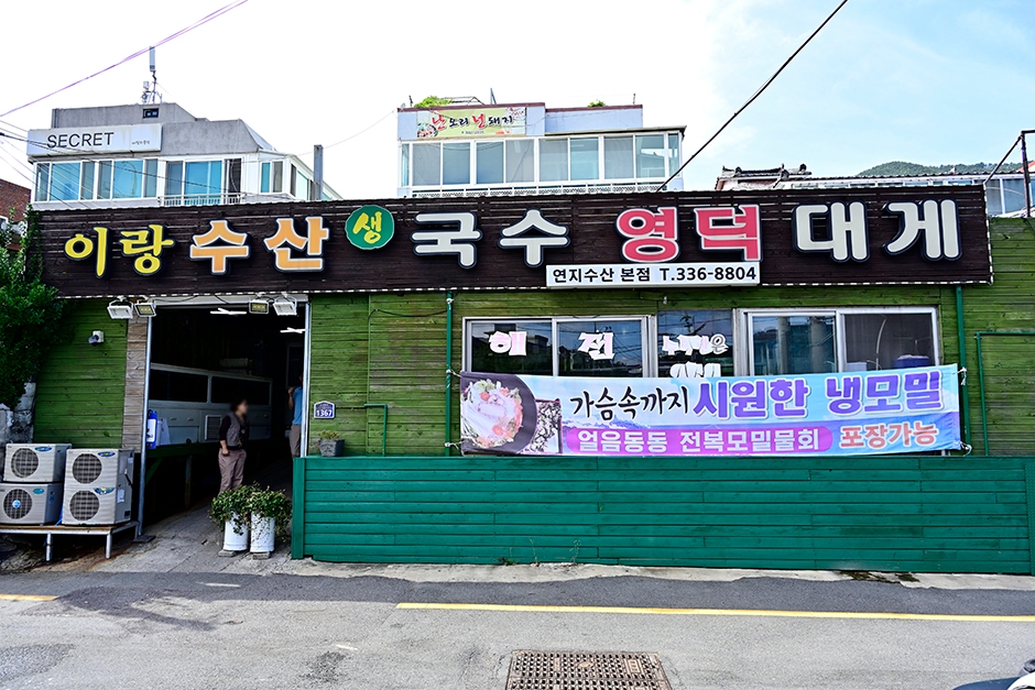 경상남도 김해에 위치한 이랑수산생국수는 이름에도 나와 있듯이 푸짐한 해물이 가득 들어간 국수 맛집이다. 이곳의 모든 해산물의 원산지가 표시되어 있어 안심하고 먹을 수 있다. 대표메뉴는 해물칼국수이다. 꽃게, 홍합, 굴, 새우, 조개류 등 해산물이 다양하게 듬뿍 들어가 있어 국물 맛이 시원하고 깔끔하다. 이외에도 조개통찜과 부침개 등도 인기가 많다. 이랑수산생국수 바로 앞에 김해 연지공원이 있어서 식사 전후에 산책하기 좋다.