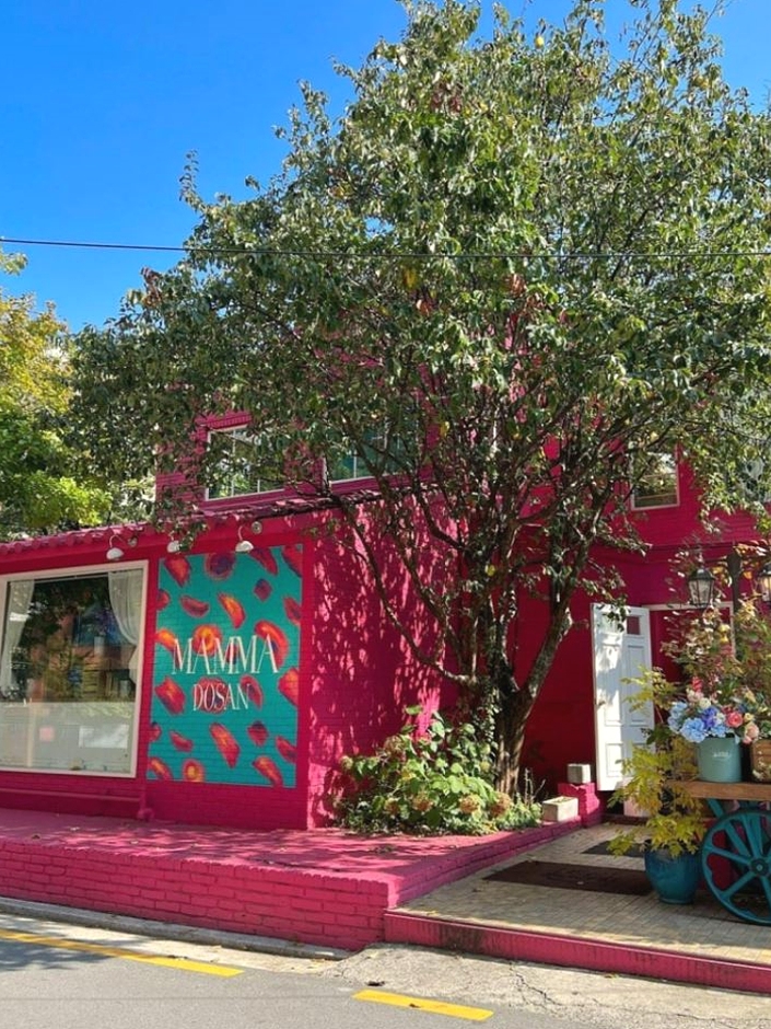 도산맘마미아는 압구정 로데오거리에 위치한 이색 디저트 카페이다. SBS 생방송투데이 등 여러 방송에 소개된 압구정 핫플레이스다. 건물 전체가 핫핑크색으로 도색되어 있고, 내부는 덩굴장미로 장식한 중앙 홀이 돋보인다. 핫핑크색의 건물과 덩굴장미, 빈티지한 분위기의 인테리어 덕분에 곳곳이 포토존이 된다.