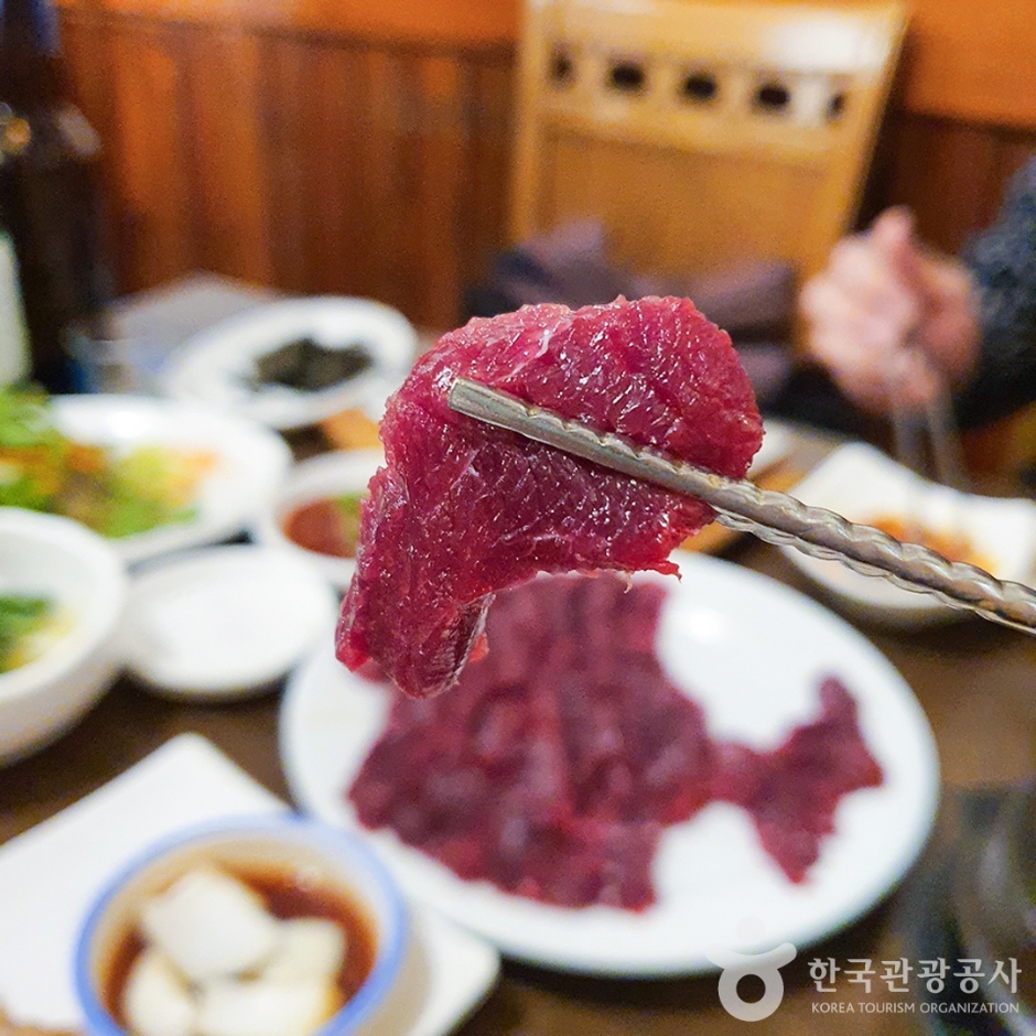 한입 크기로 뭉텅뭉텅하게 잘라준다고 하여 대구에서는 [뭉티기]라 불리는 메뉴로 대구의 향토 음식 중 하나이다. 생고기를 주문하면 역시 익히지 않은 상태로 나오는 신선한 간과 천엽 등 다양한 반찬을 곁들여 낸다.