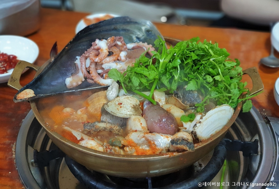 군포해물탕은 경기도 수원시 영통구 매탄동에 있는 해물탕 전문점이다. 이 식당에는 별도의 주차장이 없어 건물 옆에 유료주차장을 이용해야 한다. 오래된 건물 1층에 있으며 내부는 좌식 테이블로 신발을 벗고 들어가야 한다. 이곳은 해물탕 단일메뉴로 인원수에 따라 대, 중, 소로 시키면 된다. 주문 후에는 전복 미역국이 기본 세팅되고 반찬도 다양하게 나온다. 많은 양의 신선한 해산물에 대자에는 바닷가재 한 마리가 통째로 올라가 있다. 해물은 직접 먹기 편하게 손질해 준다. 회사 회식으로 많이 찾는 이곳은 저녁에 항상 대기가 있다. 인근에 화성행궁, 팔달문, 광교호수공원 등이 있다.