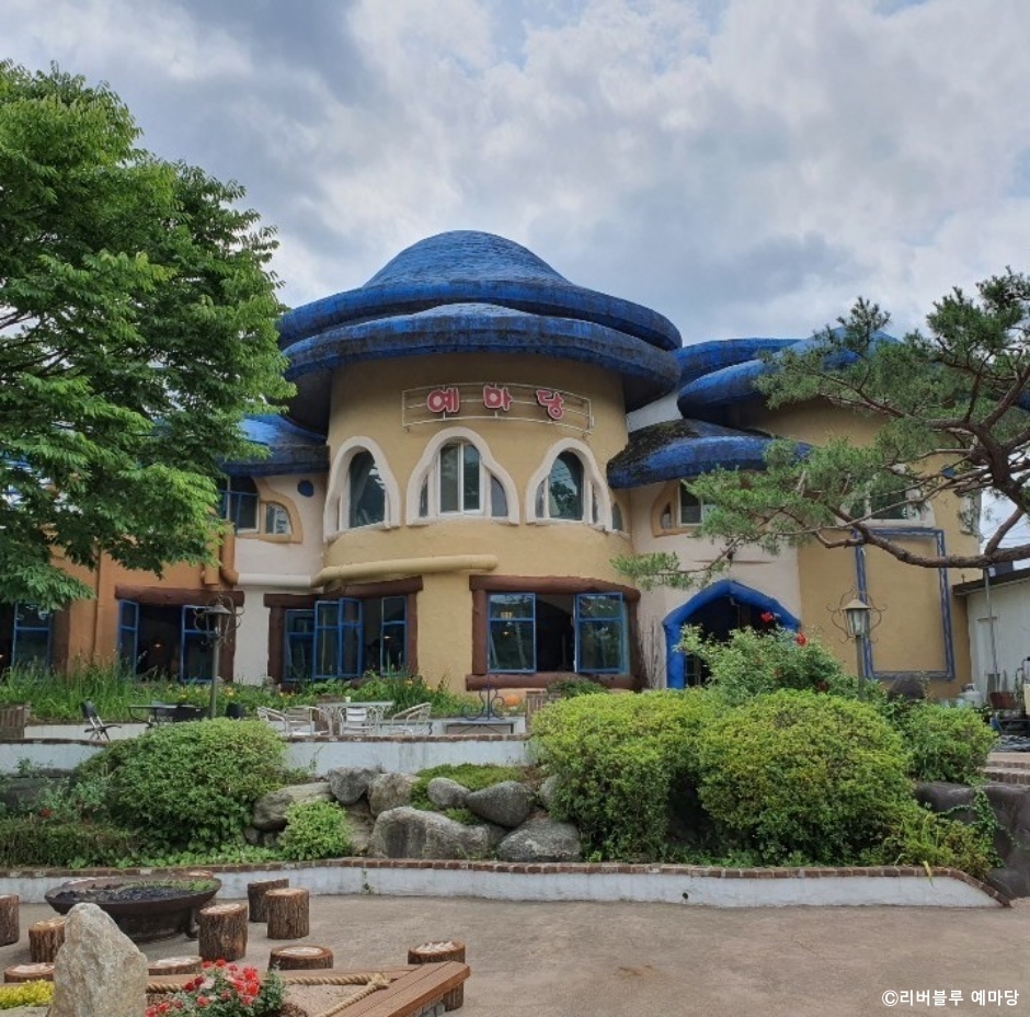 리버블루 예마당은 경기도 양평군 한여울 나루터 정원에 있는 복합문화공간으로 오픈한 지 25년이 넘은 곳이다. 위치는 양평 만남의 광장 건너편으로 한식당, 카페, 갤러리, 테라스, 무대, 공방, 구멍가게, 나루터 정원이 한 곳에 있다. 스머프 마을처럼 버섯 지붕을 하고 있는 것도 독특한 볼거리다. 식당 메뉴는 채소와 버섯이 산처럼 듬뿍 올라간 소불고기이고 반찬은 셀프 코너에서 얼마든지 가져다 먹을 수 있다. 카페 리버블루에서는 다양한 커피와 음료를 판매한다. 겨울에는 테라스에서 분식점을 운영하기도 한다. 산책도 할 수 있고, 갤러리에서 작품 감상도 할 수 있고, 식사와 커피도 마실 수 있어 리버블루 예마당을 방문하면 한 곳에서 모든 것이 가능하다. 주차장이 넓어 이용이 편리한 것도 장점이다. 반려동물 동반도 가능하다.