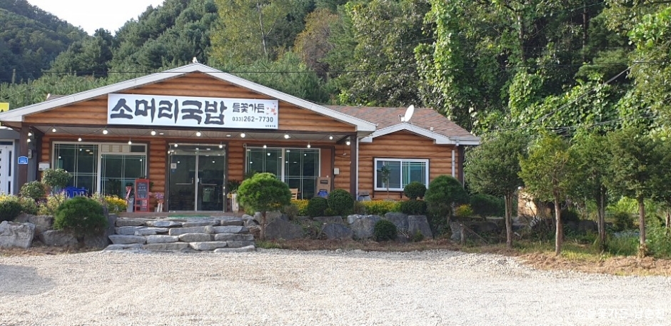 들꽃가든 남춘천은 강원도 춘천시에 있는 소머리 국밥, 해물짬뽕 순두부 맛집이다. 춘천이지만 홍천 쪽에 가까운 남춘천에 있는 식당이다. 새벽 5시부터 영업을 하는 곳이라 여행객의 아침을 책임지고 있다. 춘천시 외곽에 있어 널찍하며, 남춘천 CC를 나오면 바로 만난다. 주변에 골드힐스CC도 있어 골퍼들이 만나 아침 식사를 하고 이동하는 곳이기도 하다. 그래서 식당 옆에 작은 골프 연습장도 있다. 음식도 깔끔하고 김치 맛도 좋아 인기다. 반찬은 셀프 코너를 이용해서 추가하면 된다. 주차는 매장 앞에 넓은 주차장이 있어 이용이 편리하다.