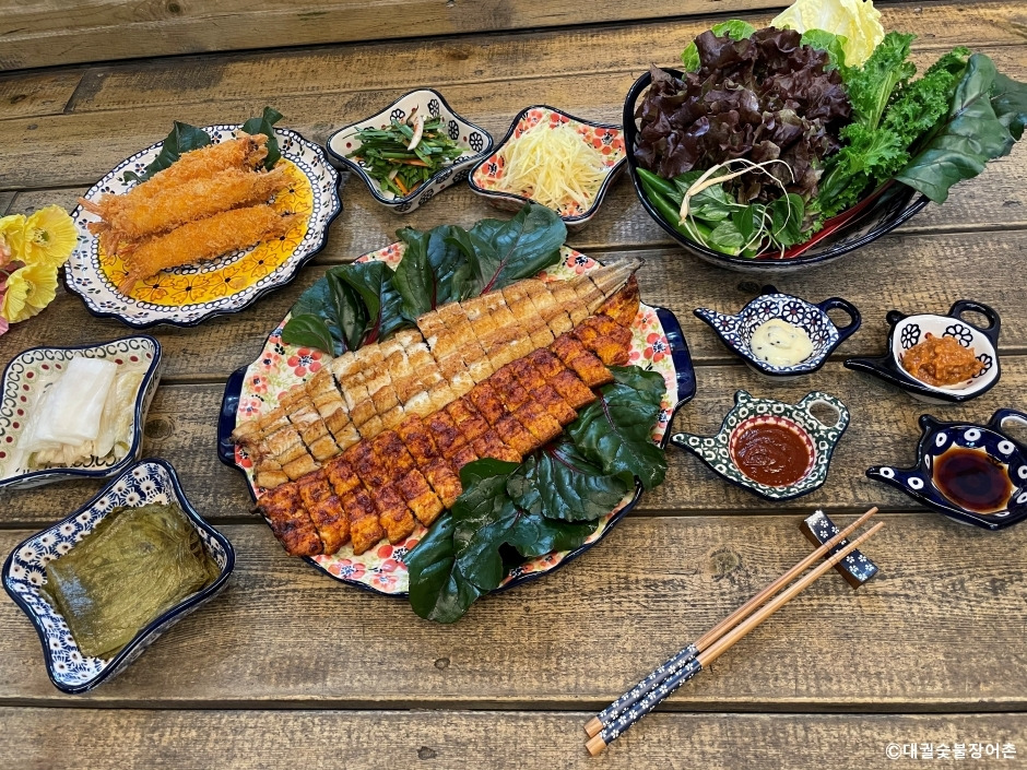 대궐숯불장어촌은 화성 동탄에 있는 민물장어 즉석 숯불구이 전문점이다. 도심 속에 있으나 나무에 둘러싸여 숲 속에서 힐링하며 식사하는 듯한 분위기이다. 실내는 입식 테이블과 좌식 테이블이 있어 편한 곳을 선택하면 된다. 민물장어 전문점이라 양념과 소금 중에서 선택하면 처음부터 끝까지 먹기 좋게 숯불에 구워 제공한다. 반찬은 쌈을 포함해서 상을 차려주면 필요할 때마다 셀프 바를 이용해서 양껏 먹을 수 있다. 주차는 매장 앞에 전용 주차장이 있어 편리하게 이용할 수 있다.
