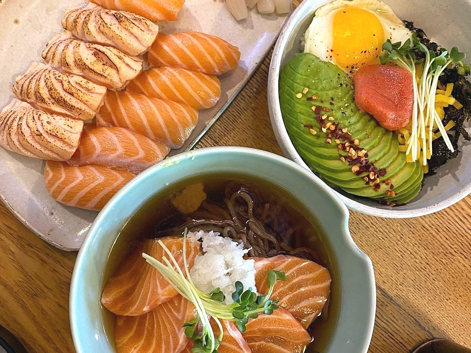 매일 숙성 생연어초밥 / 연광초밥 / 후토마끼 / 참새연어동 / 왕새우튀김 소바 외