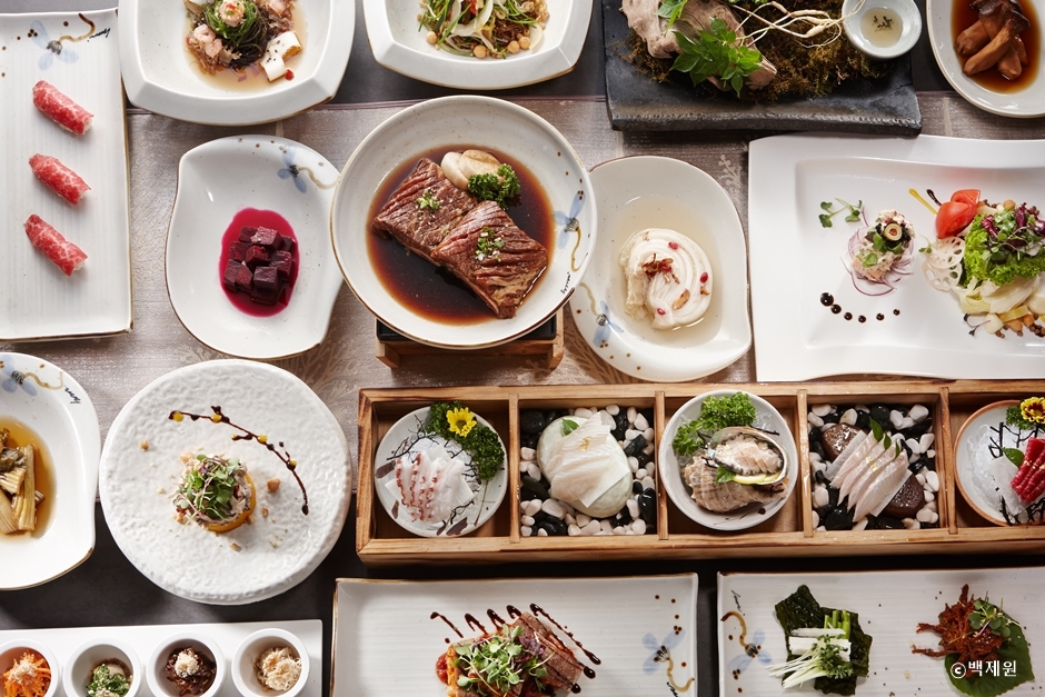 백제원 일산점은 고양시 정발산동, 밤리단길 디딤 타운에 있는 고기요리 전문점이다. 2층에 자리 잡은 이 식당은 복도를 따라 이동하면 다양한 크기의 룸이 있고 곳곳에 미니 정원을 꾸며 놓아 실내 분위기가 좋다. 또한 20명에서 80명까지 수용할 수 있는 단체 룸이 있어 돌잔치, 고희연, 가족 모임 등의 행사를 여유 있게 진행할 수 있다. 특히 이곳은 한우 오마카세 전문점으로 상견례 코스, 스페셜코스, 런치 세트 등 다양한 메뉴로 구성되어 있다. 구이에 이용되는 불판은 모두 일회만 사용하며 직원이 직접 굽고 손질해 줘서 편하게 식사할 수 있다. 또한 다양한 양념 고기를 선물 세트로 판매하고 있다. 주차장이 넓고 주차를 도와주는 직원이 상주하고 있어 주차 걱정도 없다.