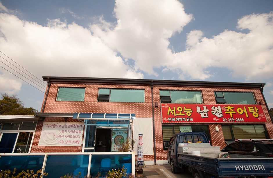 서오능남원추어탕은 몸보신에 좋은 추어탕 맛집이다. 벽돌 무늬 외관에 빨간색 간판이 깔끔한 느낌을 주는 식당으로 앞에 넓은 주차장이 마련되어 있다. 내부는 입식 테이블로 되어 있고 단체석도 마련되어 있다. 메뉴는 추어탕, 다슬기추어탕, 논우렁추어탕, 추어통탕이 있고, 불고기뚝배기, 추어튀김도 있다. 매일 담근 김치를 기본찬으로 내며, 추어튀김도 기본 반찬으로 준다.