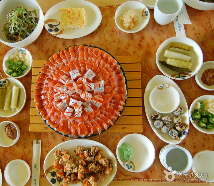 공작송어횟집은 하늘에서 보면 마치 공작새를 닮았다고 해서 붙여진 공작산휴양림 입구에 위치하고 있다. 사장님 내외분이 직접 송어양식장에서 잡은 싱싱한 송어회를 제공한다.