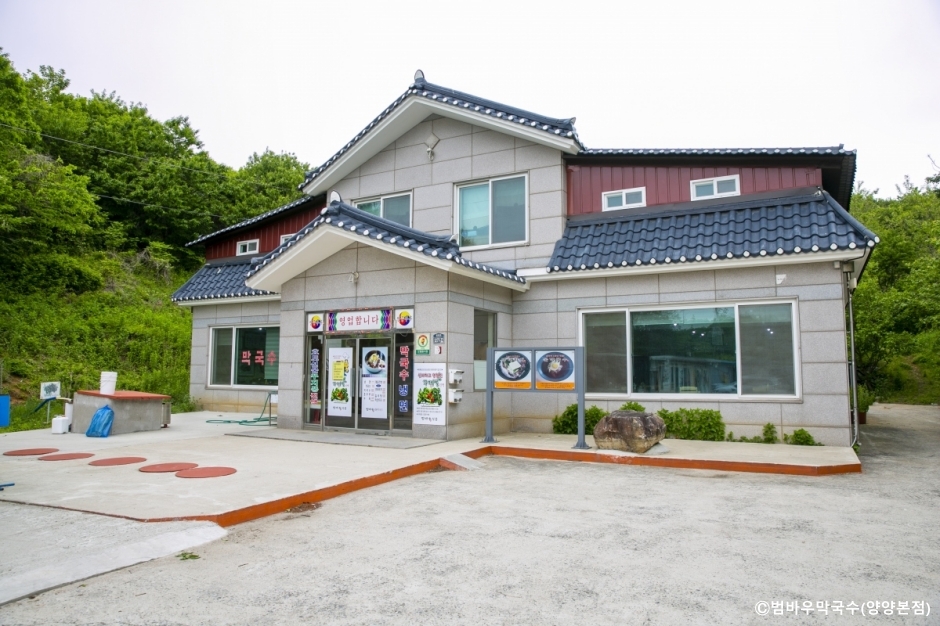 범바우막국수 양양본점은 강원도 양양군 양양 송이공원 근처에서 멀지 않은 곳에 있는 막국수 전문점이다. 꾸지뽕과 비트로 색깔도 예쁘고 달큼한 감칠맛이 독특한 육수를 만들어 막국수를 만들고 있는 식당이다. 막국수 외에도 동태찌개, 수육, 메밀전병, 촌두부 등의 곁들임 메뉴가 있어 푸짐하게 한 상을 즐길 수 있다. 아침 8시 30분부터 영업을 시작하기 때문에 아침 식사도 가능하다. 내부는 예약 룸과 홀로 구성되었고 홀은 입식이다. 무말랭이, 갓김치, 무절임으로 구성한 기본 찬이 제공된다. 부족한 반찬은 셀프바를 이용해서 추가할 수 있다. 주차는 매장 앞에 전용 주차장이 있어 편하게 이용할 수 있다.