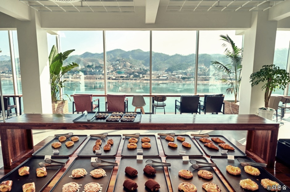 경기도 남양주시 북한강 서쪽에 있는 카페다. 라온숨은 우리말 즐겁다는 라온과 숨 쉬다는 숨을 합쳐 만든 말이다. '즐겁게 숨 쉬는 공간'이라는 이름에 걸맞게 다양한 식물뿐 아니라 카페 내부에 공기정화시스템을 갖춰 맑고 깨끗한 공기와 함께 즐거운 시간을 보내실 수 있다. 1층은 식물이 우거진 평상에 앉는 느낌의 좌식형 자리가 있고, 2층에는 베이커리 매대와 빈백의자가 있다. 3층은 갤러리로 젊은 작가 작품을 전시한다. 4층은 대관하는 곳으로 대관이 없는 경우 강을 배경으로 사진을 찍을 수 있다. 5층 캠핑관은 인조잔디에 텐트가 설치되어 캠핑 분위기가 난다. 통유리창으로 북한강을 볼 수 있도록 좌석이 놓여 있다.