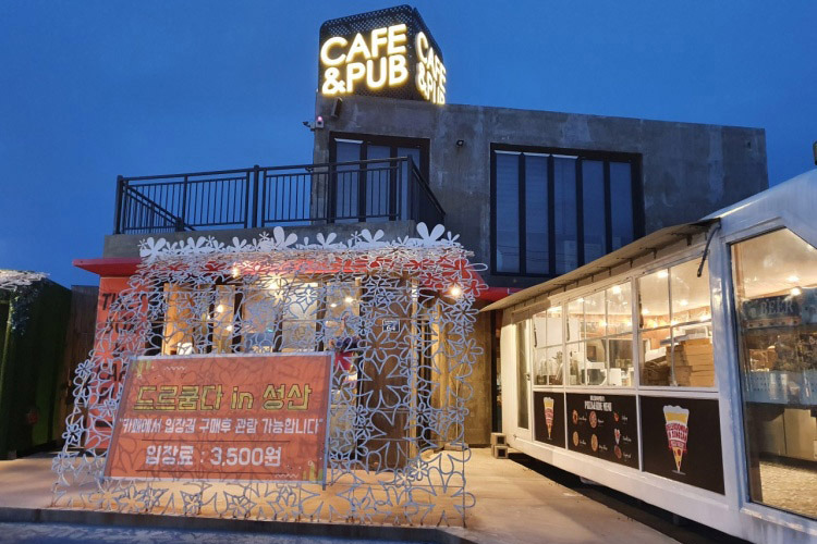 드르쿰다 카페는 광치기 해변에서 차로 2분 거리에 위치해 접근성이 좋고 부근에 유명한 관광지들이 밀접해있어 인프라가 좋아 여행 중 들르기 좋은 명소이다. 넓은 부지에 이국적으로 꾸며 놓은 잔디 광장, 돌담으로 만들어놓은 성과 추억을 되살리는 회전목마가 눈길을 끈다. 스튜디오를 연상케 하는 실내공간에서는 인생샷을 찍기 좋고 다양한 테마의 카라반을 예약하여 내부에서 파티, 보드게임을 해보는 것도 추천한다. 낮엔 디즈니, 밤엔 라라랜드 느낌으로 변하는 대형 스튜디오에서 소중한 사람들과 추억을 남기고 성산일출봉 뷰의 프라이빗 한 드르쿰다 해변에서 일광욕도 즐길 수 있다.