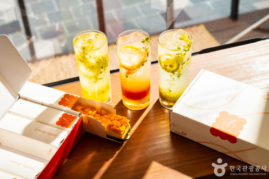 특히 치즈케이크 다섯 종이 눈에 띈다. 쌉싸름하면서도 순한 곤드레 향이 치즈의 달콤하고 짙은 풍미와 기가 막히게 어울린다. 곤드레 맛이 가장 진한 곤드레 치즈케이크부터 다른 재료와 맛이 어우러지는 흑임자며 초코, 황치즈 치즈케이크까지 입맛 따라 난이도를 선택할 수 있다. 어떤 케이크를 고르든 커피와 무척 잘 어울리고, 곤드레를 이용한 다른 음료들도 눈과 입을 동시에 즐겁게 해준다. 특히 오자몽에이드는 슬슬 햇볕이 따가워지는 계절에 선택하면 여행 피로를 청량하게 회복시켜주는 메뉴다.