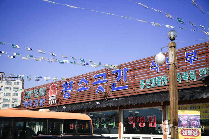 ‘황소곳간’은 경북 안동시에 위치한 소고기 구이와 불고기 맛집으로 현지인뿐만 아니라 관광객들도 많이 찾는 식당이다. 이곳은 정육식당으로 운영 중이라 직접 고기를 고를 수 있으며 좋은 가격에 구매가 가능하다. 매장 내부는 넓고 입식테이블이 많이 있어 단체 모임이나 회식 등의 장소로 좋으며 룸도 있어 조용하게 식사가 가능하다. 메뉴 주문 시 콩나물무침, 파절임, 김치 등 다양하고 정갈하게 구성된다. 대표메뉴인 불고기 전골은 양념된 고기와 당면, 파, 버섯 등이 들어가며 자리에서 끓여서 익힌 후 맛볼 수 있다. 짭짤하고 달콤한 양념이 된 고기와 흰쌀밥의 조합이 좋아 인기가 좋다.