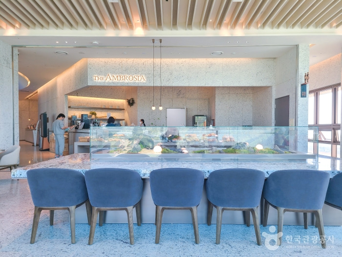 고성과 인제를 잇는 미시령 고개 부근 소노펠리체 델피노 EAST 10층에 위치한 더 엠브로시아는 통유리창 너머로 계절마다 다른 설악산의 풍경을 마주할 수 있는 카페이다. 이곳에서 바라보는 울산바위는 병풍처럼 웅장하고 한 폭의 그림 같다. 카페 구조가 통유리창을 따라 길게 뻗어있고 좌석 간 거리도 넓은 편이라 어느 자리에 앉아도 타인의 방해 없이 울산바위를 바라볼 수 있다. 당일에 갓 구운 베이커리와 향긋한 커피를 마시며 아름다운 풍경을 감상할 수 있다. 더 엠브로시아의 대표메뉴는 매일 정해진 수량만 판매하는 솔방울 라떼&쿠키 세트이고 그 외에도 커피, 차, 생과일주스, 푸딩, 케이크, 빵 등 전 연령대가 즐길 수 있는 디저트가 준비되어 있다.